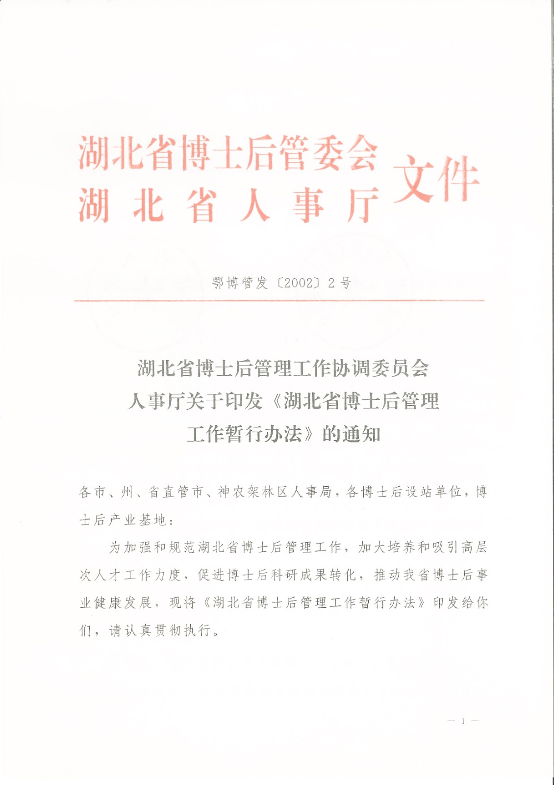 湖北省博士后管理事情协调委员会人事厅关于印发《湖北省博士后管理事情暂行步伐》的通知--鄂博管发〔2002〕2号